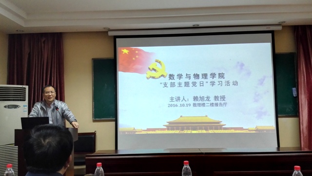 学校党委常委、副校长赖旭龙教授作题为“党的 ‘十八大’以来习总书记和党中央治国理念、治国方针数字解读”的报告。赖校长从“两学一做”的背景及意义出发,以八个数字为主线,用数字化的方式系统解读了党的“十八大”以来习总书记关于治国理政方方面面的内容。赖校长最后强调学院师生党员要加强党性修养,发扬长征精神,按照“四讲四有”的要求做合格党员,充分发挥先锋模范作用,为全面提升数理学院办学实力和办学水平而努力奋斗。