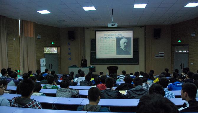 首先,我院院长刘安平对刘伟安教授作了介绍。随后,刘伟安教授为我们讲述了有关数学的历史和数学界的杰出人物。他认为数学的本质在于它的自由性,不必受传统观念的束缚,他鼓励我们推陈出新,勇于挑战,要寻出新意。他激动地说,数学好玩就是因为它极具挑战性,数学的美在于它在应用中的灵活性,人类生活和生产实践都需要它。同时他痛心疾首的说,作为一个博士生导师,面对大多数学生拘泥于所学而无法创新感到遗憾,他不希望我们将来也深受其害,他鼓励我们要关注科技前沿,接受先进的数学方法。他的精彩演讲激发了同学们对数学学习的热情与兴趣,同时也为同学们学习、思想和生活注入了数学气息,教授独特的理念和风格亦使同学们受益匪浅。本次讲受到了同学们的广泛好评,使同学们体会到了数学的独特魅力,激发了同学们学习数学的兴趣。