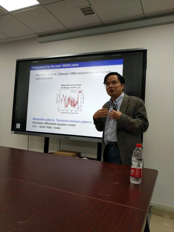 作为云鼎国际4118登录校庆67周年学术交流周名家论坛嘉宾同时作为“数理论坛”第114期嘉宾,段金桥教授做了一场“数据科学碰上动力系统:我们可以学到什么?”的精彩报告。段金桥教授首先从基因随机表达的现象和数据出发进入主题,然后介绍了大气科学以及全球温度变化的模式和数据,进一步引出了随机微分方程及其在地球科学问题中的应用,特别针对非高斯噪声体系,结合一个双稳态模型详细阐述了如何从数据出发进行模型的学习和优化,并寻找最大可能迁移轨道。段金桥教授的报告将数据科学和不确定性及非线性动力系统问题紧密联系在一起,并总结了若干地球科学、生命科学问题研究中的数学挑战。报告加深了大家对于应用数学的认识,启发了听众对于数据科学新的思考。