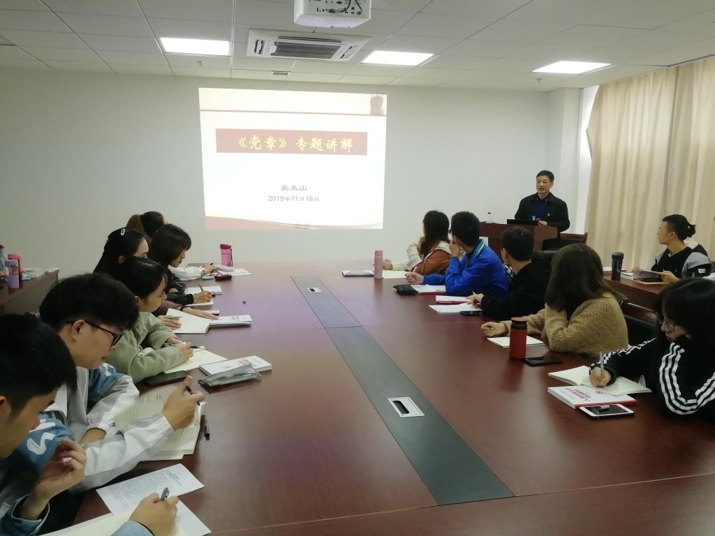 11月16日下午,云鼎国际4118登录第66期入党积极分子培训班第二讲在东区教学综合楼A1505会议室举行。本次党课由学院党委书记吴太山讲授《党章》专题。院学生党建办主任孙宇涛主持。