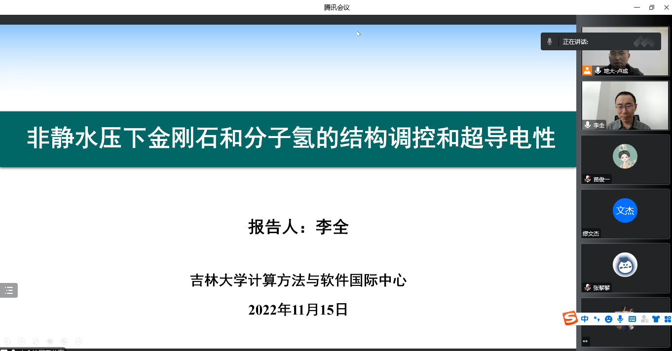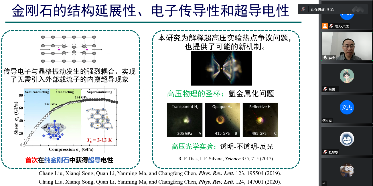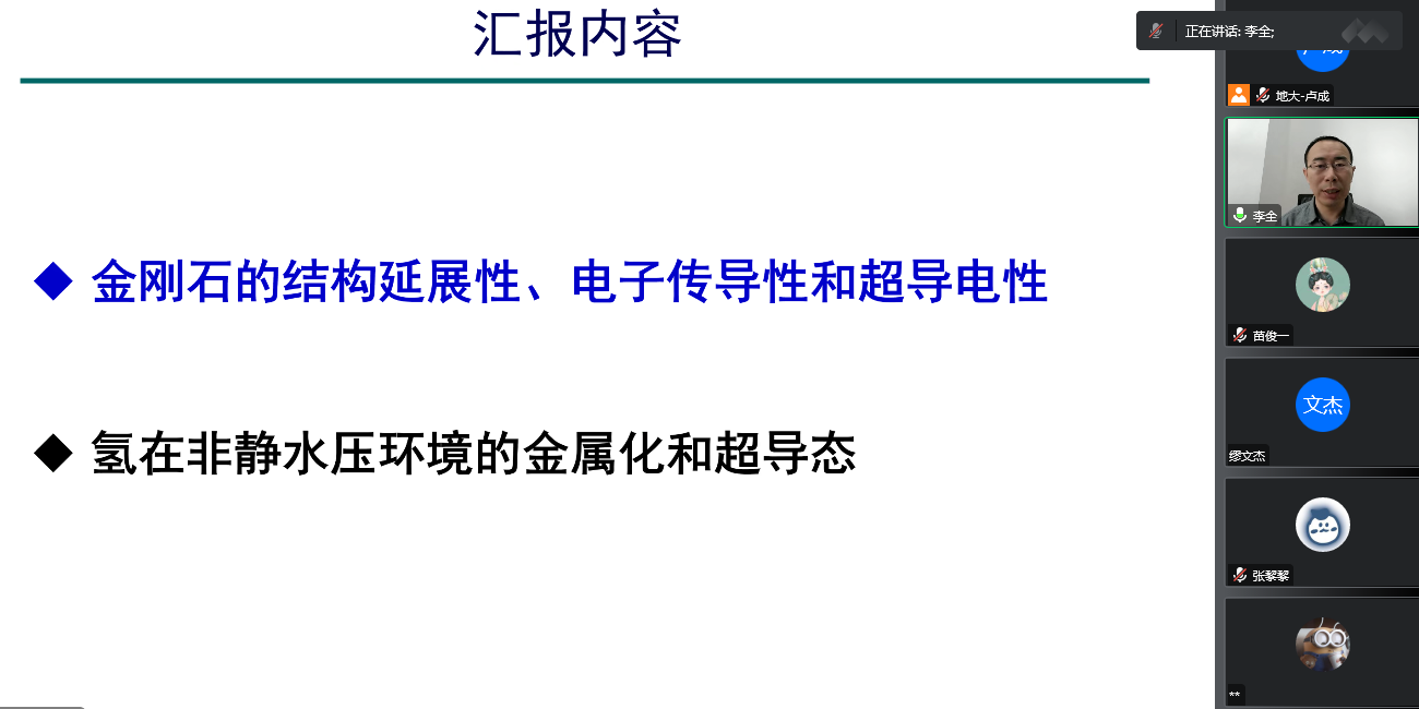 为迎接我校七十周年校庆,11月15日上午,云鼎国际4118登录通过线上的方式,邀请吉林大学计算方法与软件国际中心李全教授,为我校物理系师生做了题为《非静水压下金刚石和分子氢的结构调控和超导电性》的学术报告。该报告由我校科学技术发展院、云鼎国际4118登录联合举办,卢成教授主持,本院师生共计60余人参加。