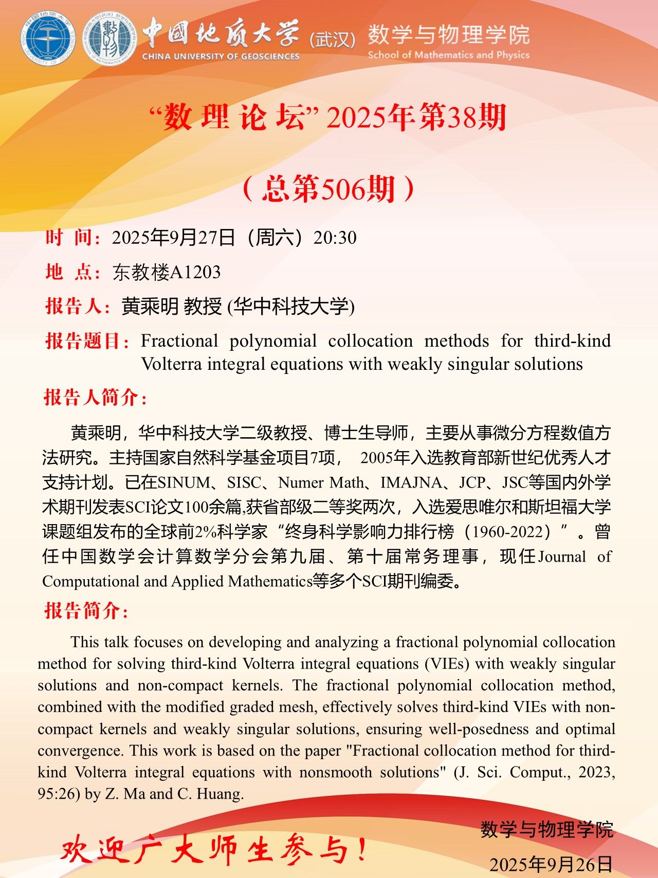 2025年9月27日黄乘明教授学术讲座:Fractional polynomial collocation methods for third-kind Volterra integral equations with weakly singular solutions